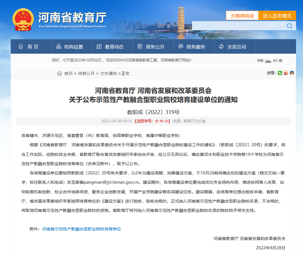 近日,河南省教育厅、河南省发展和改革委员会公布中高职19个省示范性产教融合型职业院校培育建设单位名单,我校以排名第一的成绩成功入选。