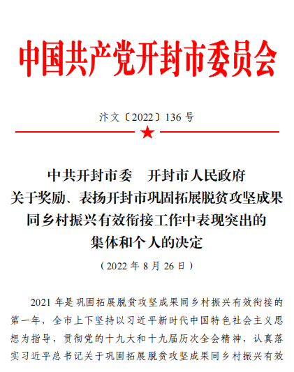 近日,开封市委下发《中共开封市委 开封市人民政府关于奖励、表扬开封市巩固拓展脱贫攻坚成果同乡村振兴有效衔接工作中表现突出的集体和个人的决定》(汴文〔2022〕136号),我校驻刘店乡郭景村工作队获通报表扬。