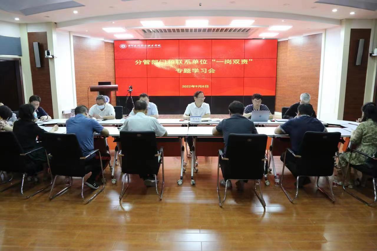 9月8日下午,副校长刘守义在四号实训馆多功能演播厅主持召开分管部门和联系单位“一岗双责”专题学习会。图书馆、学报编辑部、信息化管理办公室、基本建设办公室、资产经营管理中心、基础部、体育部等部门和单位的全体中层干部参加了会议。