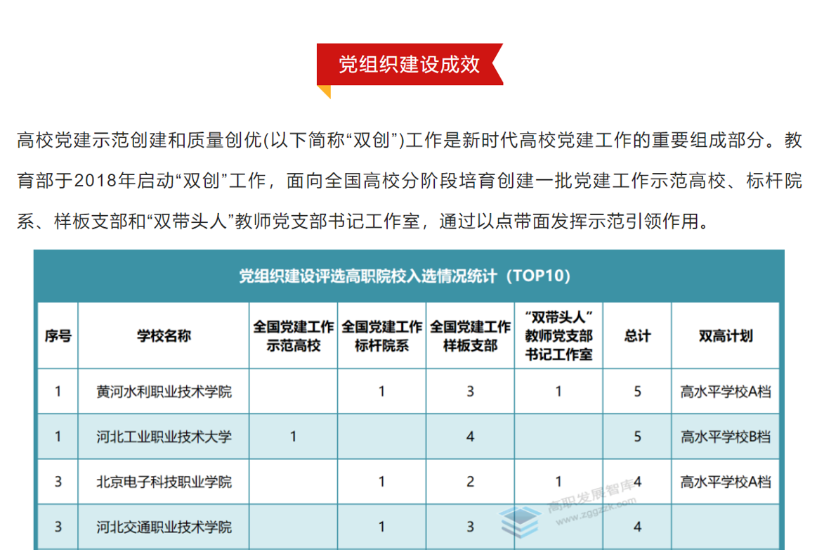 近日,高职发展智库对“双高”建设以来各高职院校党建工作成效进行了评选,我校在党组织建设成效方面表现突出,以入选全国党建工作标杆院系1个、全国党建工作样板支部3个、“双带头人”教师党支部书记工作室1个的优异成绩,排名位列全国高职院校首位。