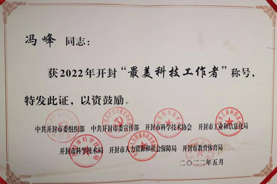 苗琛、杜静晶为“最美科技工作者”冯峰教授颁发证书、奖杯。冯峰教授表示将在以后的研究工作中,不忘初心,牢记使命,带领河南省黄河中下游水资源节约集约利用工程技术研究中心及博士团队继续努力,立足开封,深耕厚植,勇力创新,助力地方社会经济发展,服务黄河流域生态保护和高质量发展重大国家战略。(供图:环境工程学院 党委宣传部)