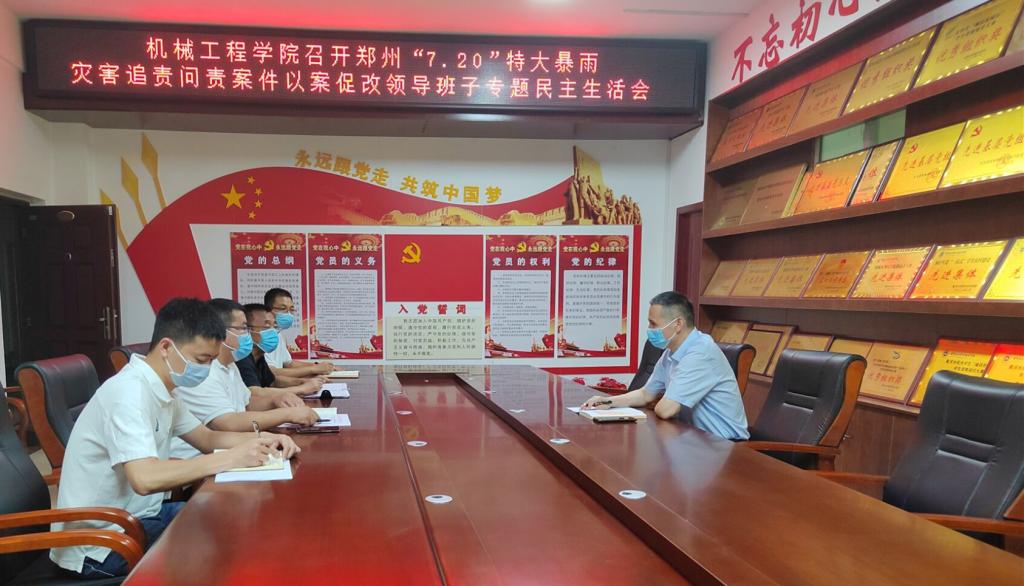 5月24日上午,机械工程学院领导班子在5号实训馆212室召开了郑州“7·20”特大暴雨灾害追责问责案件以案促改专题民主生活会,校纪委书记朱焕立到会参加指导,学院领导班子成员参加会议,学院兼职纪检员、教工机电工程支部书记列席会议。会议由院党总支书记王振强主持。