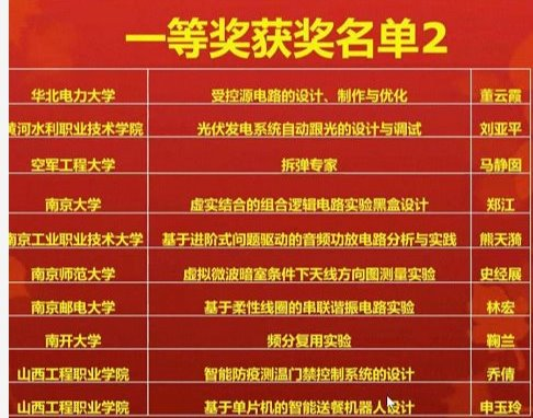 我校刘亚平、何瑞、刘金浦三位老师的“光伏发电系统自动跟光设计与调试”实验项目,在获得该赛中南赛区一等奖后,晋级参加全国总决赛,与来自南开大学等学校的老师同场竞技。经历教学设计演示、专家提问答辩、实验授课能力竞赛等环节后,斩获全国一等奖。
