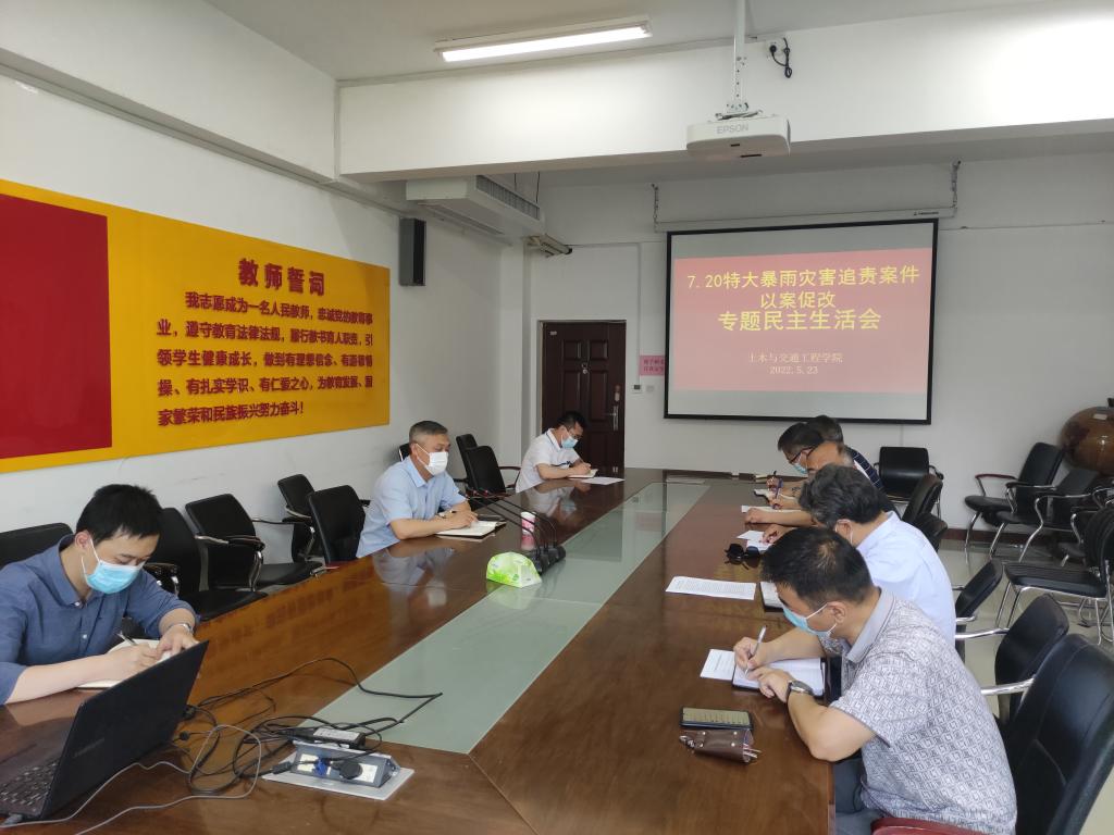 5月23日下午,土木与交通工程学院领导班子在实训馆5330会议室召开郑州“7.20”特大暴雨灾害追责问责案件以案促改专题民主生活会,副校长刘玉宾、学院领导班子成员及有关人员参加会议。会议由土木与交通工程学院党总支书记赵杰主持。