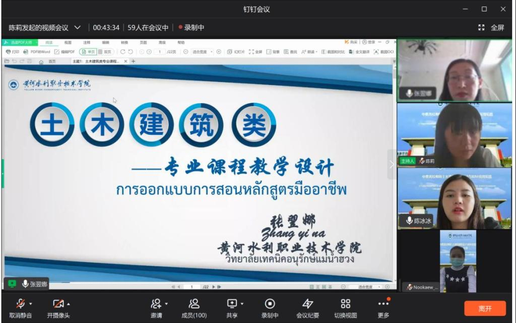 土木与交通工程学院教师张翌娜、李向分别以《土木建筑类专业课程教学设计》和《BIM技术综合应用概述》为题,通过专题讲授、视频展示、案例讲解等方式为参训教师进行了线上授课。泰国参培教师表示,通过两位老师的精彩讲解,让他们对建筑类专业的课程建设和建筑信息模型有了全新的认识,希望将来能到我校进一步交流学习。(供图:对外联络合作处)