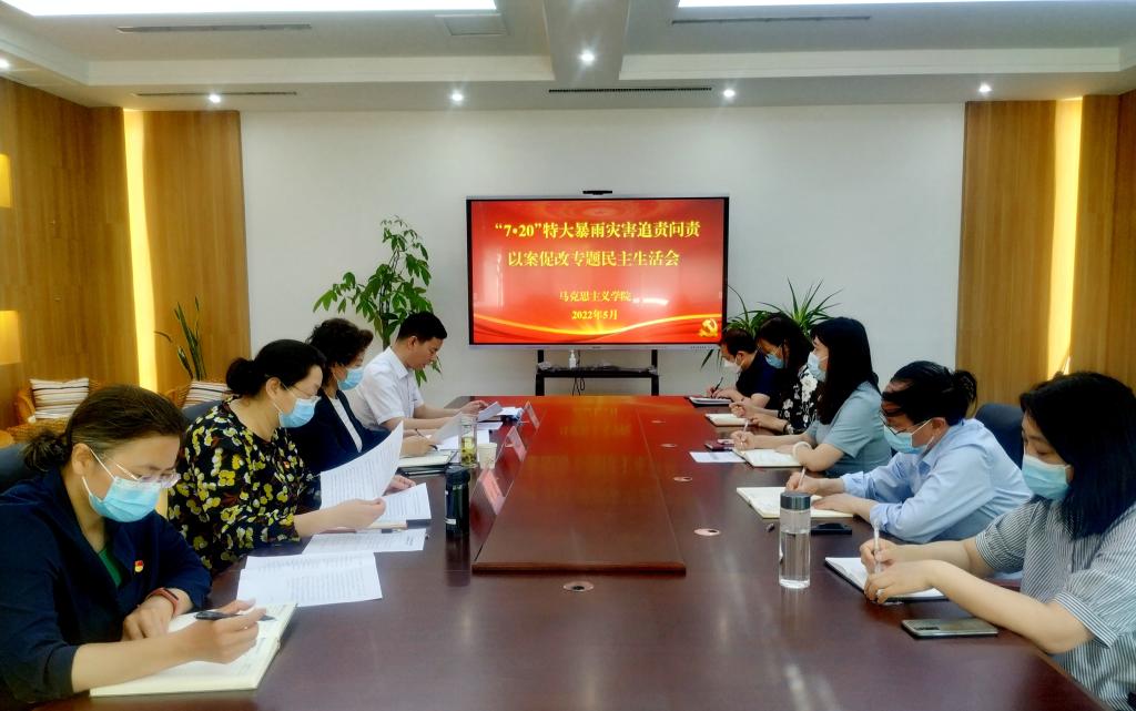 5月26日下午,马克思主义学院在党建活动室召开“7·20”特大暴雨灾害追责问责以案促改专题民主生活会。校党委书记周保平全程参加并指导会议。马克思主义学院院长兼直属党支部书记焦红强、副院长白霞以及科级以上干部、支委会成员参加会议。会议由焦红强主持。
