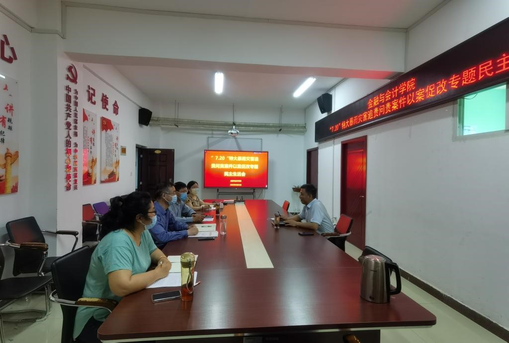 5月23日下午,金融与会计学院领导班子在5号实训馆412室召开郑州“7.20”特大暴雨灾害追责问责案件以案促改专题民主生活会,副校长菅浩然全程参加并讲话。金融与会计学院班子全体成员参会。会议由金融与会计学院党总支书记吴宗奎主持。