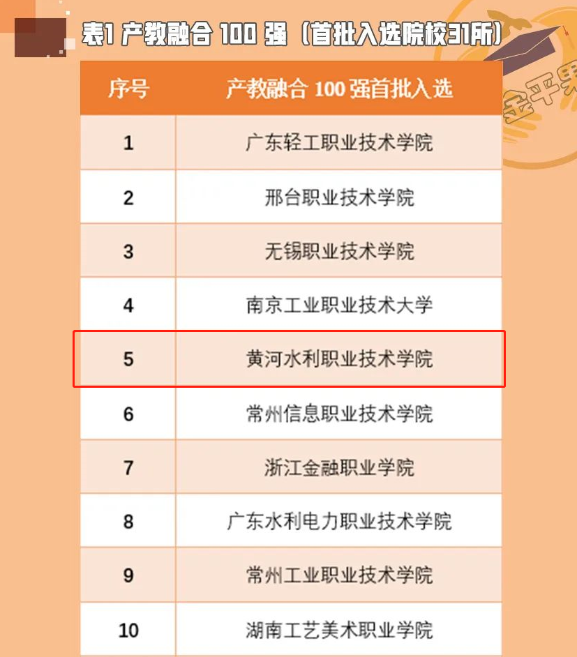 5月9日,“金平果中国科教评价网”全国高职院校“产教融合100强”评选结果揭晓,我校成为首批入选的31所高职院校之一,位列全国高职院校第5名,是我校在产教融合、校企合作方面获得的又一项荣誉。
