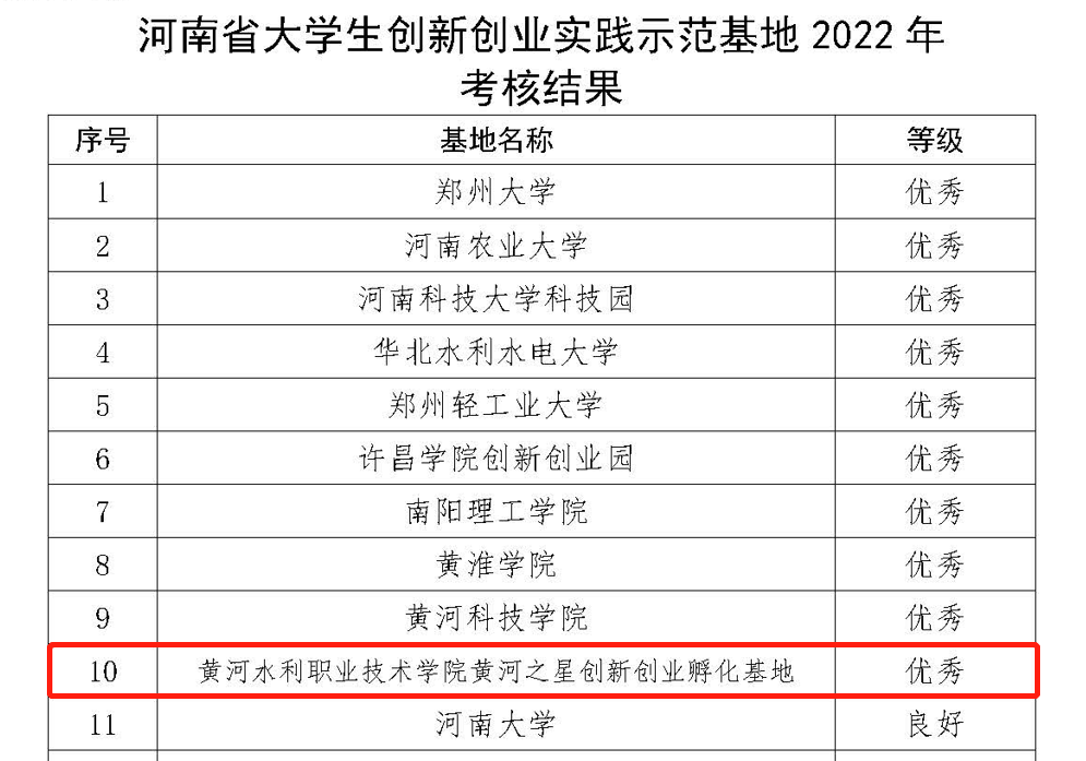 河南省教育厅对2015年-2017年评选认定的28个省大学生创新创业实践示范基地进行考核,共评选出优秀10个、良好15个、达标2个、不达标1个。