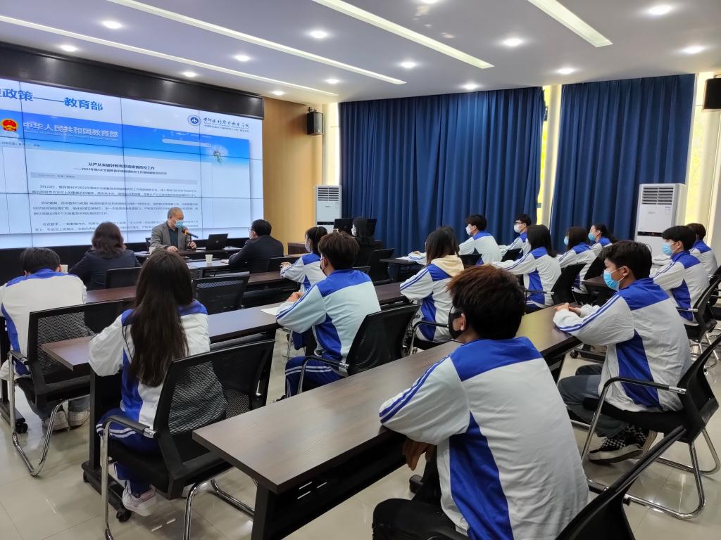 杨士恒从当前疫情形势、疫情防控政策、学校疫情防控举措以及对同学们的期望和要求四个方面给学生上了一堂生动的思政课。杨士恒介绍了国内外以及河南省内疫情总体形势,传达了中央“外防输入、内防反弹”和“动态清零”的防疫精神和防控策略,详细解读了教育部疫情防控八项要求、河南教育防疫“十条”、开封防疫“七大关口”,着重介绍了学校为保证学生安全健康所采取的疫情防控举措。