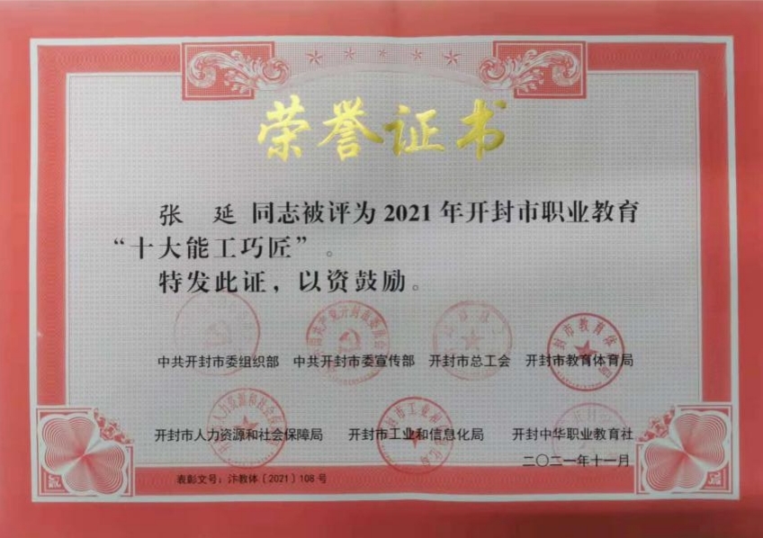 近日,开封市委组织部、市委宣传部,开封市总工会、教体局、人社局、工信局,开封中华职教社等7部门联合发布《关于表扬开封市职业教育“十大名师”“十大名班主任(辅导员)”“十大能工巧匠”“十大雏鹰工匠”的通知》(汴教体〔2021〕108号),我校机械工程学院张延教授荣获开封市职业教育“十大能工巧匠”称号。