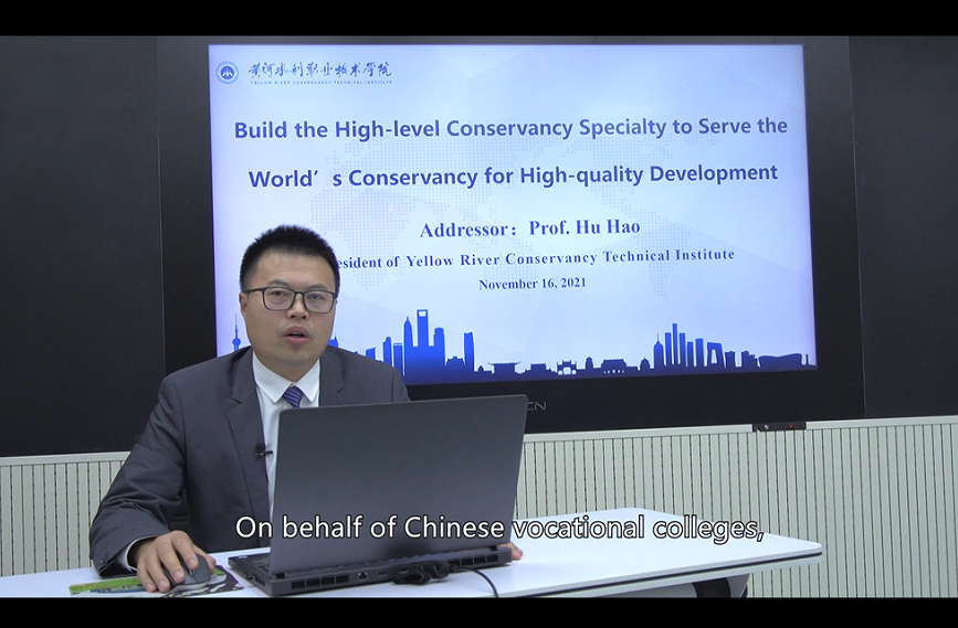胡昊以《打造水利类高水平专业群,服务世界水利高质量发展》为题做主旨发言,介绍了我校在水利类专业建设过程中的探索与实践。一是面向现代水利,优化专业机制。水利类专业经过90多年的发展,已涵盖水利水电建筑工程、水利工程运行与管理等10多个专业和方向,形成优势互补和资源共享的专业融合机制。二是制定标准方案,引领行业发展。学校牵头、主持了全国水利大类的专业标准和资源建设;主持制定全国高职水利水电建筑工程专业的“两标准一方案”、《国家职业大典》中水利行业7个工种职业标准。三是搭建技术技能创新平台,支撑水利人才培养。学校建设有国家智能社会治理实验基地、国家级职教示范性虚拟仿真实训基地,拥有多个省级工程技术研究中心和市级重点实验室,形成市-省-国三级技术技能创新平台矩阵。四是依托大禹学院,打造国际教育品牌。学校先后在赞比亚、南非建立海外分校大禹学院,针对当地水利行业发展情况和人才需求开发专业标准,培养当地急需的技术技能人才,为“一带一路”沿线国家贡献了黄河水院智慧。五是开展国际认证,对接世界标准。学校与英国国家学历学位评估认证中心合作进行水利水电建筑工程等专业的国际评估认证工作,涉及领域包括资历框架建设、职业国际资格证书开发等,致力于打造国际认可的专业标准、教学标准和教学资源。