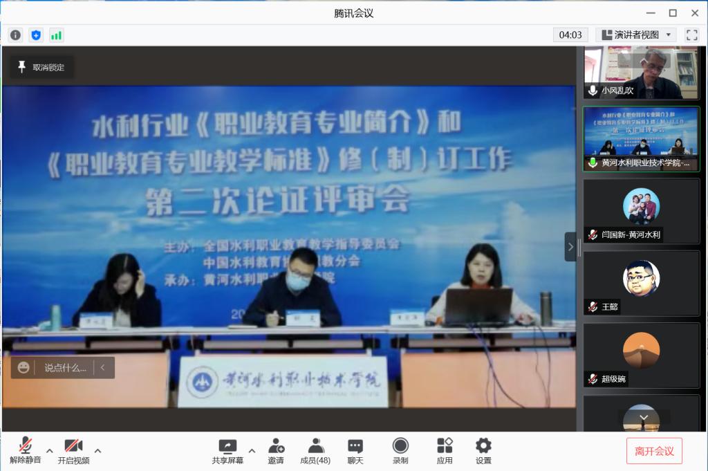 11月12日,由全国水利职业教育教学指导委员会、中国水利教育协会职业技术教育分会主办,我校承办的水利行业《专业简介》和《专业教学标准》修(制)订工作第二次论证评审会在线上召开。中国水利教育协会副会长兼秘书长王韶华,中国水利教育协会职教分会会长、水利大类专业简介和专业教学标准(以下简称《简介》和《标准》)修制订行业工作组组长、我校校长胡昊,副校长焦爱萍出席会议,水利工程学院院长陶永霞以及各专业修订指导组、研制组负责人等参加会议,会议由陶永霞主持。