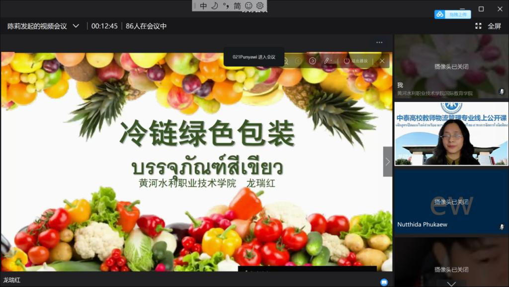 商务与管理学院教师张玉玲、龙瑞红分别以《冷链预处理》和《冷链绿色包装》为题,通过课件讲授、视频展示等方式为参训教师进行了线上授课。泰国参培教师表示,通过此次培训对冷链物流管理及实际操作中存在的问题和解决方法有了更详细的了解,希望在条件允许的情况下有机会到我校交流学习。