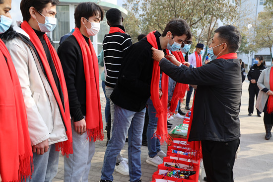 副校长菅浩然为留学生佩戴象征福气的红围巾
