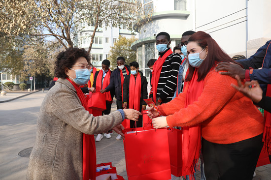 周保平对疫情期间留学生们配合和支持学校的各项工作表示感谢,并就寒假期间的学习和生活情况与留学生进行亲切的交流。她叮嘱留学生要继续做好科学防护,注重个人健康、加强锻炼,度过一个快乐平安的中国年,并为留学生佩戴象征福气的红围巾、发放新春礼物。同时,她向市出入境管理部门和金耀派出所的同志对我校来华留学生工作的支持与帮助表示感谢。