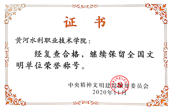 长期以来,学校党委高度重视文明创建工作,始终把文明单位建设纳入学校发展的总体规划,坚持立德树人根本任务,以构建文明和谐校园为目标,以社会主义核心价值观为引领,以创新校园文化为动力,以体制机制建设为保障,努力构建文明单位建设长效机制,全校上下团结一心,积极推动各项创建工作落到实处。学校于2015年2月被中央文明委命名为“全国文明单位”,2017年11月通过复查,继续保留“全国文明单位”称号,此次“全国文明单位”荣誉称号的确认保留是国家、省、市和社会各界对我校办学成就和文明创建工作的充分肯定,必将更大地鼓舞激励全校师生员工凝心聚力,乘势而上,满怀豪情再踏新征程,不断深化内涵式发展,创建具有黄河水院特色的精神文明建设品牌,奋力书写学校高质量发展的新篇章。