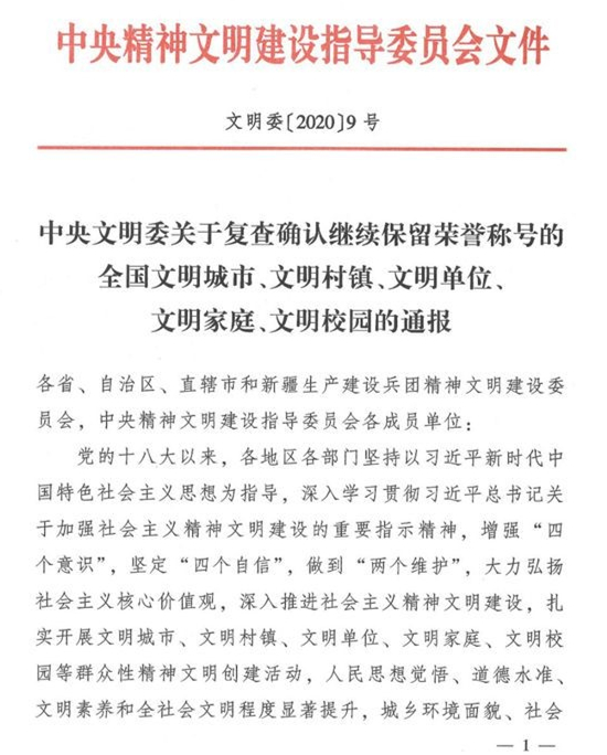 近日,中央精神文明建设指导委员会下发《关于复查确认继续保留荣誉称号的全国文明城市、文明村镇、文明单位、文明家庭、文明校园的通报》(文明委〔2020〕9号),我校顺利通过复查,继续保留“全国文明单位”荣誉称号。