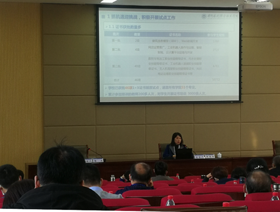 焦爱萍以《扎实推进1+X证书试点工作,不断提升复合型技术技能人才培养质量》为题进行了典型发言。她从“抓机遇迎挑战,积极开展试点工作;探索书证融通,深化培养模式改革;学校多措并举,提升教师教学能力;主动服务行业,做好国家试点准备”等4个方面详细介绍了1+X证书制度改革在我校的具体实践和我校主动服务水利行业,做好国家试点准备的特色做法。发言展现了我校在探索书证融通,深化人才培养模式改革,多措并举提升教师教学能力等方面的鲜明特色和卓有成效的工作成果,得到了与会人员的一致赞同。(供图:教务处)