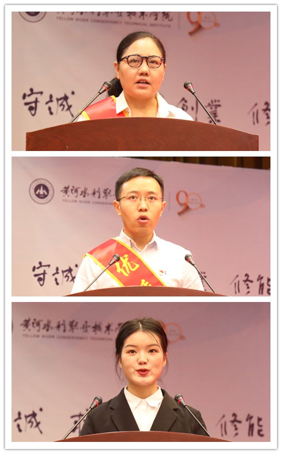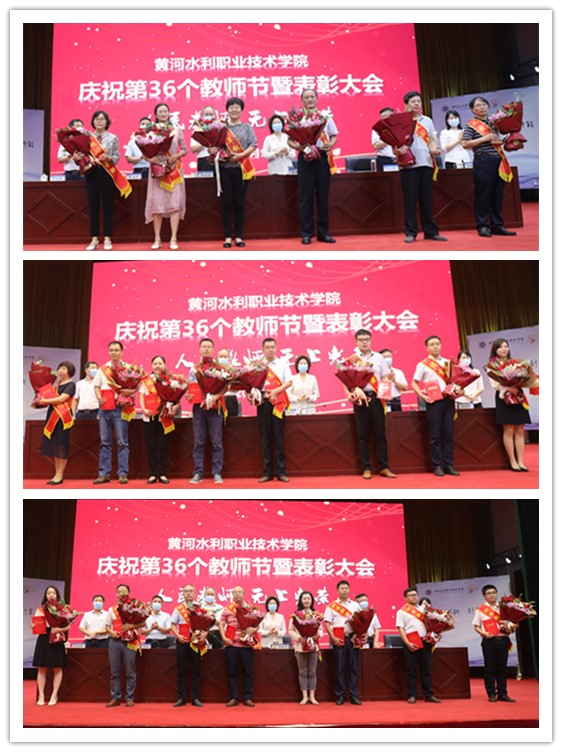 刘卫锋、菅浩然分别宣读了《关于表彰2020年从事教育教学工作满三十年教师的决定》《关于表彰2020年优秀教师和优秀教育工作者的决定》。大会向受表彰的教师进行颁奖。中原教学名师、优秀教师代表丁爱萍,青年教师代表代凌辉,学生代表孙英分别进行了发言。教师工作部部长周志琦带领全体教师重温了教师誓词。