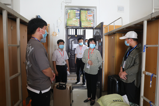 校领导一行依次来到北门入校通道、身份核验点、各二级学院报到处、宿舍、学生食堂等地检查指导,了解各站点实时情况,并对一线工作人员进行了亲切慰问。在各二级学院报到处,校领导了解学生返校报到情况,强调要优化、规范流程,务必把工作做实做细,确保学生返校工作安全、圆满完成。在学生宿舍,校领导与返校学生亲切交谈,对他们的到来表示欢迎,并询问他们的身心状况和学习安排,希望大家做好防护工作,尽快投入学习生活,共同营造安全健康的校园环境。返校学生对学校的关心以及细心的安排表示感谢,纷纷表示会积极配合学校疫情防控工作,珍惜返校学习的机会,圆满完成各项学习任务。