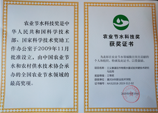 9月21日—22日,全国农业节水和农村供水技术发展高峰论坛暨全国农业节水农村供水技术与设备博览会在长沙举行。水利部原副部长、中国农业节水和农村供水技术协会原会长翟浩辉出席会议并做专题报告。中国工程院院士、中国农业节水和农村供水技术协会会长康绍忠主持开幕式。会议同期举办2018-2019年度“大禹杯”农业节水科技奖颁奖大会,我校冯峰博士带领其研究团队完成的项目《三义寨灌区灌溉作物需水量试验关键技术研究与应用》获得农业节水科技奖三等奖。该研究项目响应国家发展战略黄河生态保护和高质量发展,开展黄河水资源的节约集约化利用,同时也是与河南省豫东水利工程管理局深度开展校地合作,服务河南农业大省,服务地方经济发展的具体体现。在54个获奖项目的主要完成单位中,我校是唯一一所高职院校获奖完成单位,凸显了我校教师在科学技术研究方面的实力。