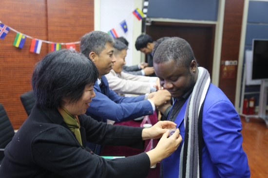 国际教育学院院长王爱琴详细介绍了我校留学生教学与管理的具体安排及要求,并要求2018级留学生在校期间要遵守校纪校规、努力学习,学有所成。随后,参会领导为留学生们佩戴了校徽。