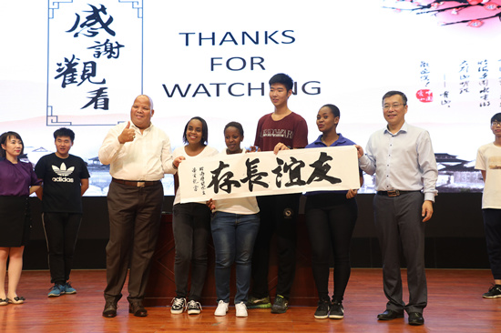 一段活力十足的开场秀拉开了晚会帷幕。我校学生带来的武术表演《双节棍》、书法表演等,使南非留学生感受了我国深厚的历史文化底蕴。水利工程学院学生潘资杭现场泼墨书写“友谊长存”四个字,并将其赠送给Errol Randall Gradwell。南非留学生表演的传统舞蹈《MANGO》别具一格,淋漓尽致地展现了南非的传统文化,也表达了南非留学生对黄河水院的热爱之情、对水院师生的感激之情。中间穿插的互动游戏将晚会气氛推向高潮。大合唱《朋友》充分表达了我校学子期待与南非留学生搭建友谊桥梁的美好愿望,以及在新时代不忘初心,砥砺前行,共创美好明天的决心。晚会在优美的歌舞表演中落下帷幕。(供图:水利工程学院)