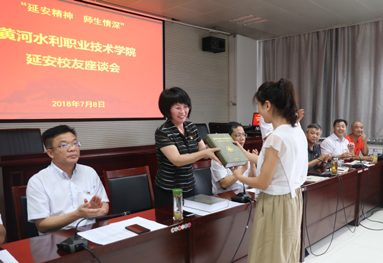 祝玉华向校友代表赠送《黄河水利职业技术学院志》