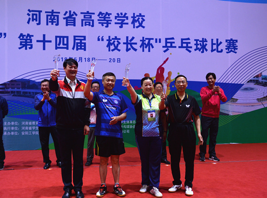 5月19日上午,河南省高等学校第十四届“校长杯”乒乓球比赛在安阳工学院拉开帷幕。我校领导许琰、王卫东、杨士恒、刘卫锋、刘玉宾等组成的代表队奋勇拼搏,经过激烈角逐,最终斩获第三名的优异成绩。