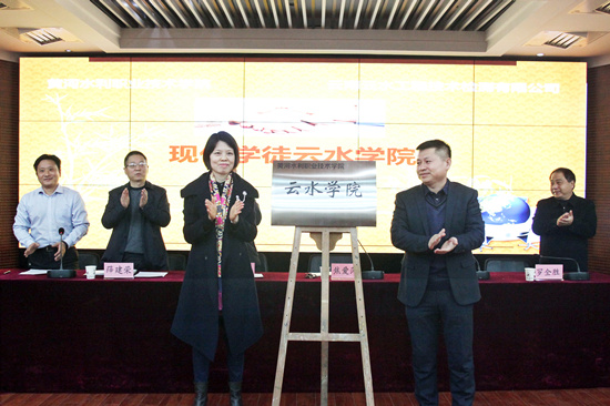 随后,焦爱萍与张玉飞为双方共建的“云水学院”揭牌。水利工程学院院长罗全胜、总经理张玉飞分别代表双方签署了现代学徒制校企合作协议。双方本着“资源共享、优势互补、互利互惠、共同发展”的原则,就专业的需求变化、现代学徒制人才培养模式的建立、社会服务、实训基地建设等方面进行了深入的探讨和交流。(供图:水利工程学院)