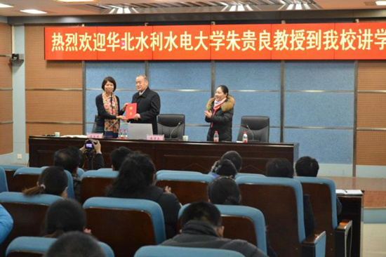 为进一步加强师德修养,塑造教师人格魅力,践行“教书育人 为人师表”的神圣职责,11月30日下午,我校特邀华北水利水电大学教授朱贵良来校做《学行攀峰 梦垂百年》专题报告,副校长焦爱萍出席报告会。全校专兼职教师共同聆听了本次报告,报告会由质量管理办公室主任、教务处副处长丁爱萍主持。