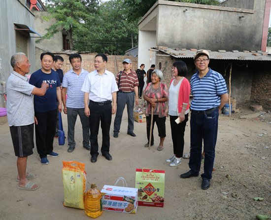 6月30日下午,我校党委书记许琰,党委副书记、校长祝玉华带领有关部门负责同志,到开封市祥符区刘店乡郭景村慰问我校扶贫工作队员,检查指导扶贫工作,并看望郭景村“结对帮扶”贫困户,对扶贫情况进行调研。
