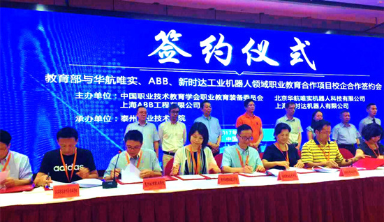 6月26日,教育部与华航唯实、ABB、新时达工业机器人领域职业教育合作项目校企合作首批签约会在泰州举行。我校成功入选教育部工业机器人领域职业教育项目合作院校和首批签约校。副校长焦爱萍和项目负责人作为建设院校代表,参加了本次签约会。