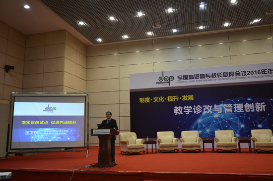 会上,我校党委副书记、副校长王卫东代表高职院校在教学诊改与管理创新版块做题为“落实诊改试点,促进内涵提升”的典型发言,向全体与会代表介绍了我校作为教学诊改试点院校的发展历程及我校教学质量保障体系的建设历程和建设成效,展示了我校教学诊改试点工作推进思路、质量保障体系运行架构,阐述了我校“十三五”发展规划的总目标和专项规划的目标链、实施链,以及我校试点工作的任务,并就我校近期工作的推进方案进行了介绍。发言受到了与会专家及代表的一致好评。