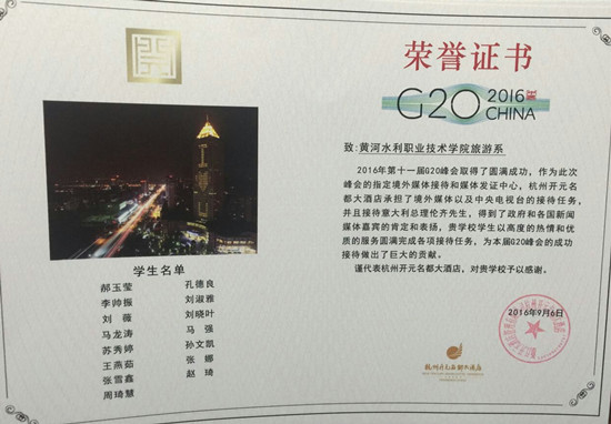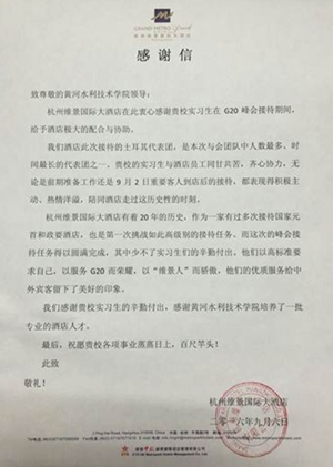 杭州维景国际大酒店来信说,“贵校实习生与酒店员工同甘共苦,齐心协力,无论是前期准备工作还是9月2日重要客人到店的接待,都表现得积极主动、热情洋溢,陪同酒店走过这历史性的时刻。”“感谢贵校学生的辛勤付出,感谢黄河水利职业技术学院培养了一批专业的酒店人才。”