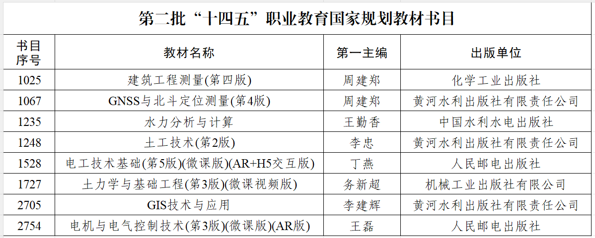 根据《教育部办公厅关于组织开展第二批“十四五”职业教育国家规划教材遴选工作的通知》(教职成厅函〔2025〕1号)要求,在各省级教育行政部门、全国行业职业教育教学指导委员会、教育部职业院校教学(教育)指导委员会、教育部直属高校推荐的基础上,经形式审查、网络评议、会议评议、公示等程序,共确定2957种教材为第二批“十四五”职业教育国家规划教材,我校周建郑教授主编的《建筑工程测量(第四版)》等8部教材入选。