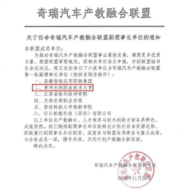 近日,从奇瑞汽车产教融合联盟传来喜讯,我校成功当选联盟副理事长单位,成为全国首批六家副理事长单位之一。此次入选,标志着校在深化校企合作、服务汽车产业高质量发展方面取得新突破,也为学校进一步融入汽车产业创新生态、提升人才培养与产业适配度奠定了坚实基础
