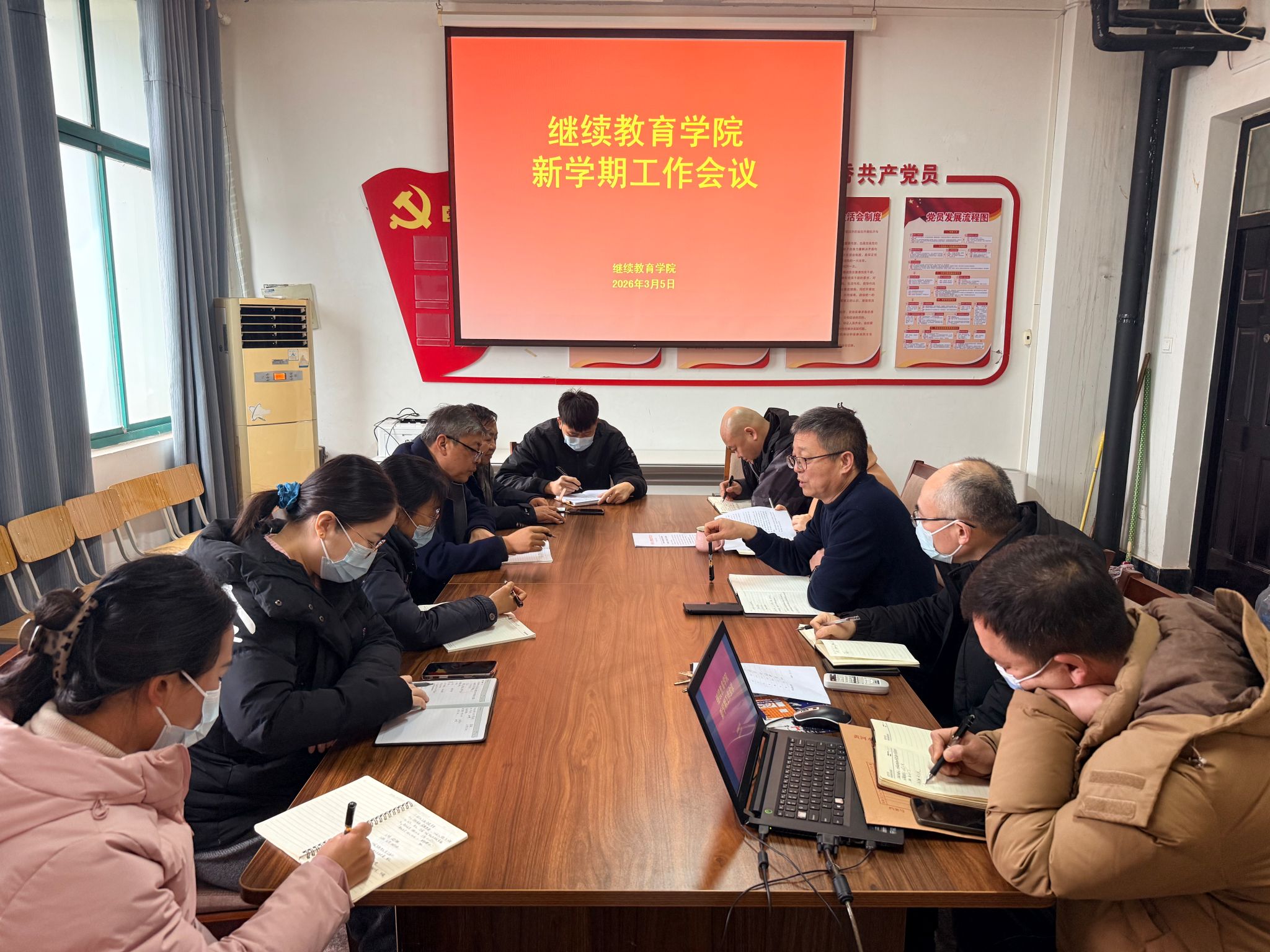 3月5日,继续教育学院在4号教学楼四楼会议室召开新学期工作会议,全面总结2025年工作成效,部署安排2026年重点任务。会议由院长薛建荣主持,全体教职工参加会议。
